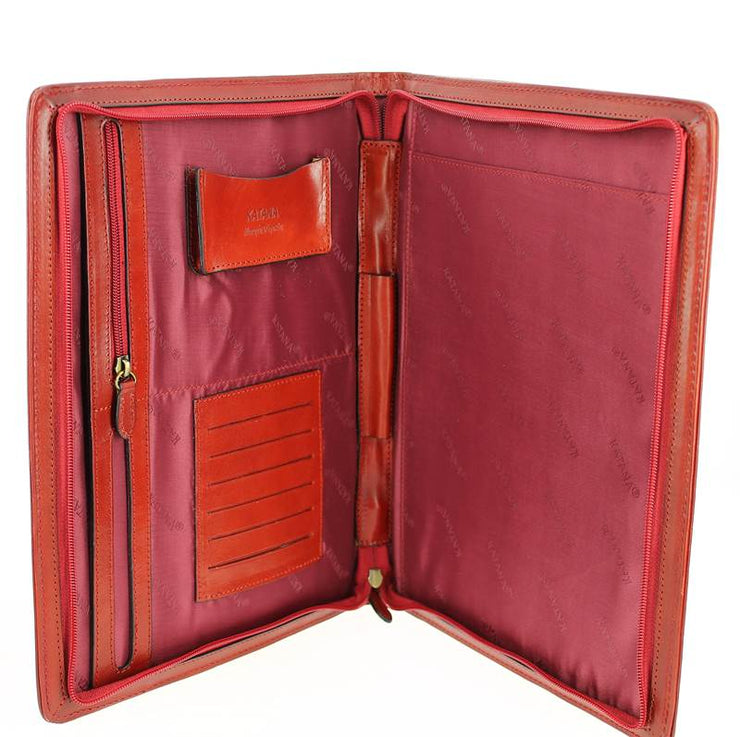 Ce conférencier tout en cuir est signé Katana. Ce porte-documents dispose à l'intérieur d'un compartiment principal et de plusieurs poches de rangement. Il est muni de six compartiments dédiés aux cartes diverses et d'un passant pour stylos. Il se compose d'un compartiment pour glisser un bloc note A4, d'un compartiment zippé et d'un ouvert. L'ensemble se ferme à l'aide d'une fermeture éclair.