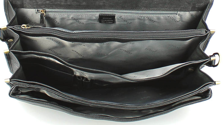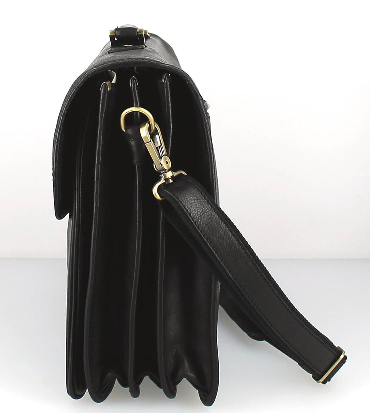 Serviette Katana tout en cuir véritable de vachette trois compartiments. Ce cartable se ferme par un clip coulissant verrouillable (une clef fourni). Muni d'une bandoulière amovible et réglable sur sa longueur, il peut être porté sur l'épaule ou à la main grâce à sa poignée supérieur. Deux grandes poches plates avant. Trois compartiments principaux disposant de deux poches zippées. Dans le premier soufflet, deux emplacements pour les cartes, deux passants à stylos et deux poches plates. Une poche zippée au dos du sac. Très pratique et classique, ce sac vous séduira par sa contenance, ses nombreuses poches et la qualité de son cuir.